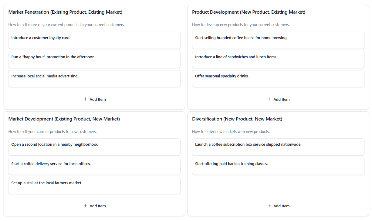 This Ansoff Matrix lays out a comprehensive set of growth strategies for a local coffee shop. It moves from lower-risk, core-business optimizations to higher-risk ventures, providing a clear roadmap for expansion.