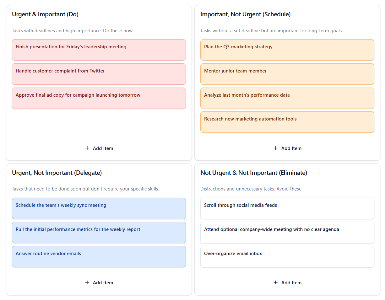 This Eisenhower Matrix provides a snapshot of a marketing manager’s week, balancing urgent deadlines with important strategic work. It’s a classic example of juggling reactive tasks with proactive planning in a corporate environment.