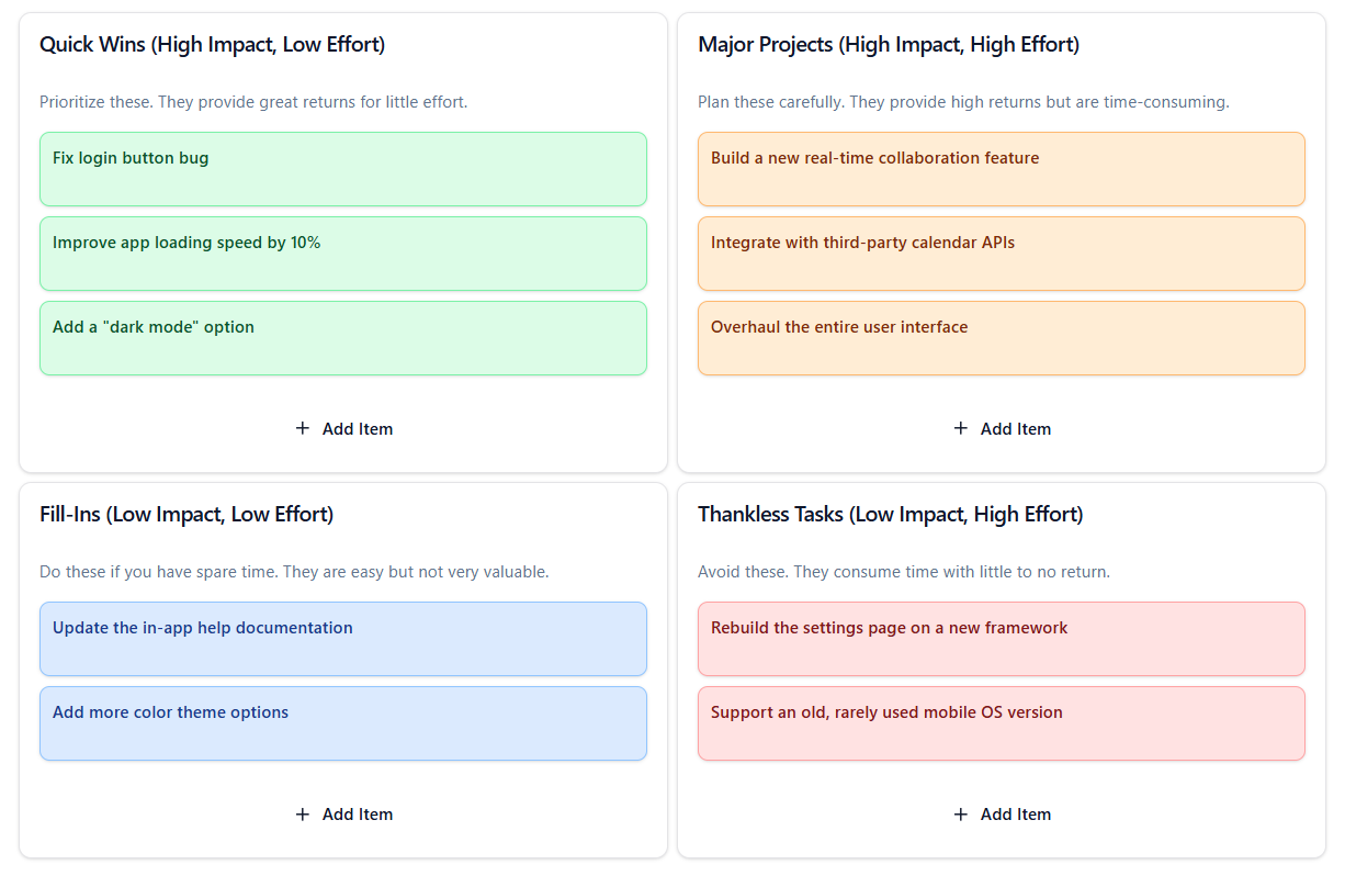 • Focus on Foundational Wins: The ‘Quick Wins’ quadrant is filled with tasks that improve the core user experience (‘fix login bug’, ‘improve loading speed’). Tackling these first builds momentum and demonstrates a commitment to quality before moving on to bigger features.