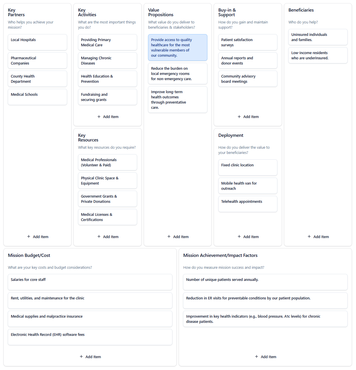 - Value Proposition Extends Beyond the Patient: The model wisely includes a ‘Value Proposition’ for the broader healthcare system: ‘Reduce the burden on local emergency rooms’. This is a powerful argument when seeking funding from hospitals or government entities, as it frames the clinic as a cost-saving solution, not just a charity.