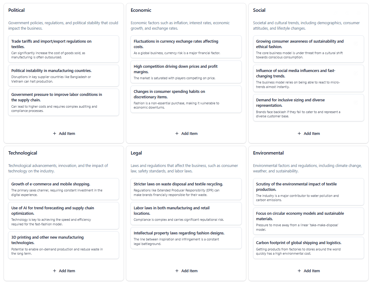 This PESTLE analysis explores the external forces shaping the fast fashion industry, where speed, affordability, and ethics often collide. It highlights how regulatory changes, economic pressures, and growing social awareness are redefining how brands design, produce, and distribute fashion globally.