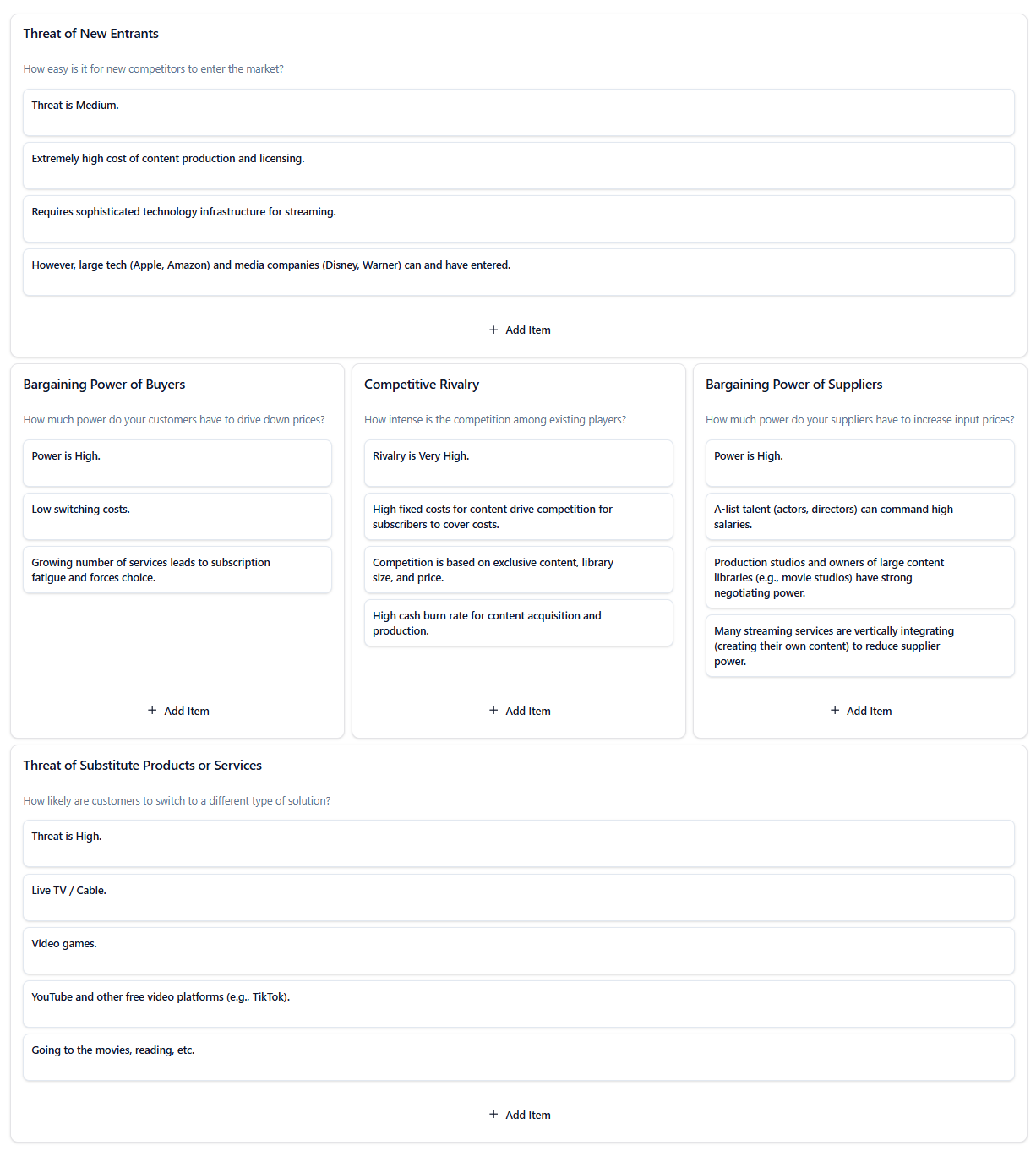 • Supplier Power is Paramount: The ‘Bargaining Power of Suppliers’ (content creators, studios, talent) is extremely high. This force dictates the industry’s economics, leading to massive spending on content production and licensing, which is the primary driver of competition.