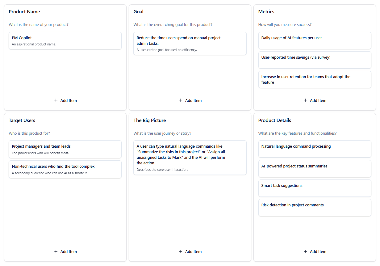 This canvas was created to illustrate how teams can align around a shared understanding of the product by blending AI insights with visual planning.