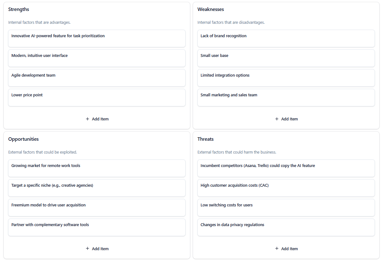 • Market of Niches: The ‘Opportunity’ to ‘target a specific niche’ is the most viable path to survival. Competing head-on with Asana or Trello for the general market is a losing battle. The AI feature (Strength) can be tailored to solve a unique problem for a specific vertical (Opportunity).