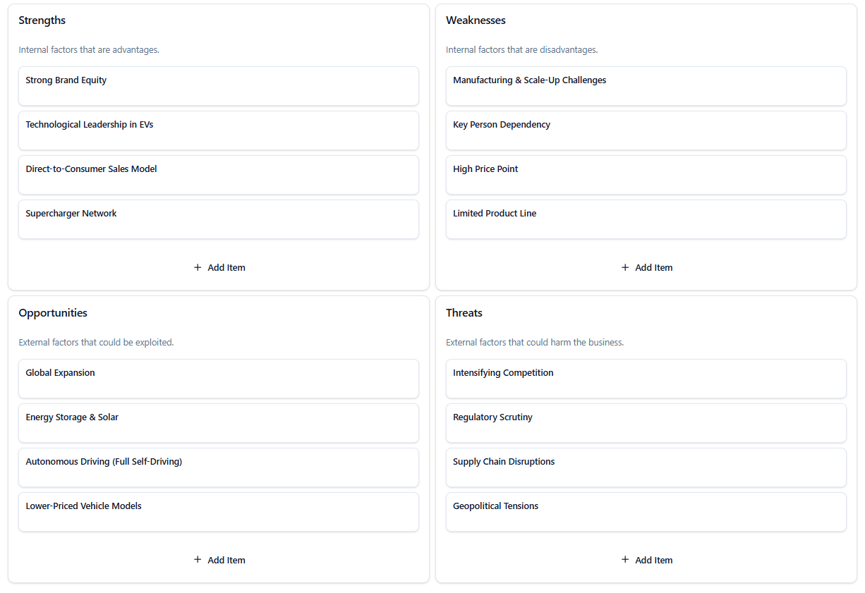 Tesla is at a strategic inflection point. Its past success was built on innovation and brand in a market with few competitors. Its future success will depend on its ability to transition into a mature, efficient manufacturing company that can compete on scale and price. The company must leverage its brand (Strength) to enter new markets and product categories (Opportunities) while simultaneously addressing its production weaknesses to fend off the coming wave of competition.